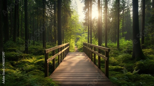 © wudu_8, Obraz premium Path in a pine forest leading to a wooden bridge