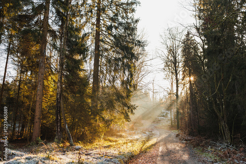 © DSMT, Obraz premium Path in a pine winter forest. Forest road among tall trees. Forest landscape.