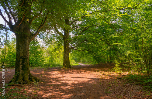 © Naj, Naklejka premium Path in a sunny forest in sunlight in spring