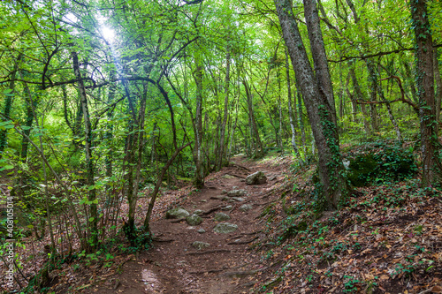 © evgenii, Fototapeta premium Path in autumn forest, landscape, rain, autumn