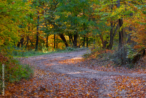 © Maria, Fototapeta premium Path in autumn forest with colorful leaves