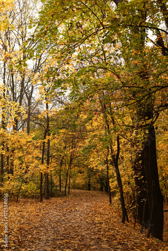 Fototapeta premium Path in autumn forest with yellow leaves. Colorful autumn landscape.