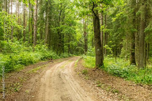 Fototapeta premium Path in Bialowieza Forest in Poland,nordic walking sign