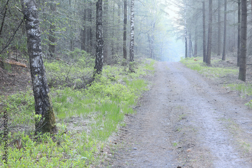 Fototapeta premium path in birch forest in fog