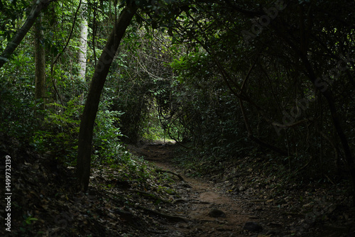 © Krittipong T., Fototapeta premium Path in Dark Forest – Mysterious Trail Through Trees for Fantasy, Nature, or Moody Landscape Background