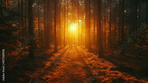 © Anna, Fototapeta premium Path in forest with sun shining through trees on both sides