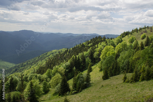 © Khrystyna Pochynok, Naklejka premium path in green summer mountains with white cloudy blue sky