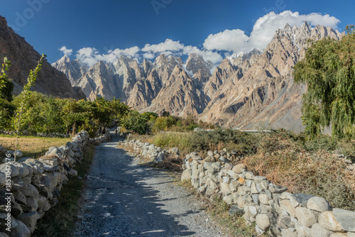 Fototapeta premium Path in Hunza valley under Passu (Cathedral) cones, Gilgit-Baltistan region of Pakistan