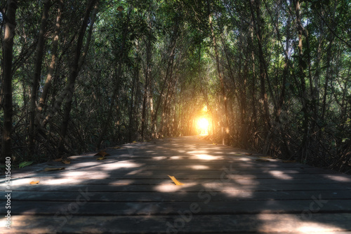 © ake1150, Obraz premium Path in Mangrove forest with sunlight at tree tunnel in Thailand.