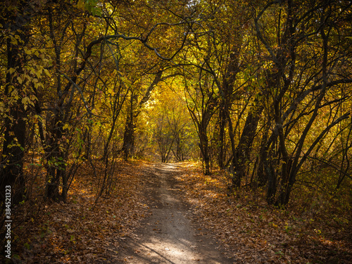 Obraz premium Path in the autumn forest among the trees with yellow leaves lit by the sun