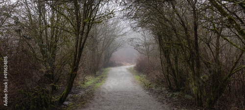 © edb3_16, Naklejka premium Path in the Canadian rain forest with green trees. Early morning fog in winter season. Tynehead Park in Surrey, Vancouver, British Columbia, Canada.