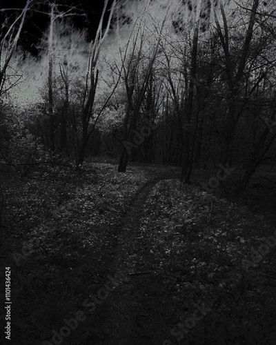 Naklejka premium Path in the dark forest, atmospheric horror woods, gloomy mood, black sky...