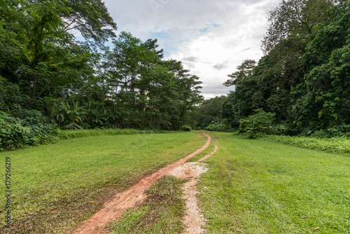 Naklejka premium Path in the forest. A dirt road in the middle of trees and grass. Path in the forest