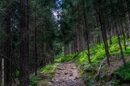 © Oliver Dünser, Fototapeta premium path in the forest lined by blueberry bushes in spring