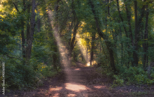 © Lana Kray, Fototapeta premium Path in the forest with morning rays of sun in the fog