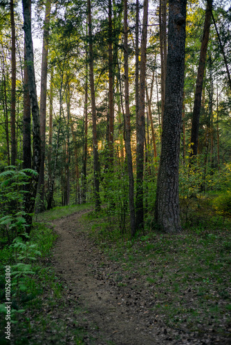 Obraz premium Path in the forest with the setting sun breaking through the branches of the trees. Vertical orientation.