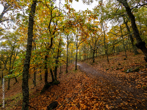 © Luis, Obraz premium Path in the middle of the chestnut forest with the dry leaves on the ground