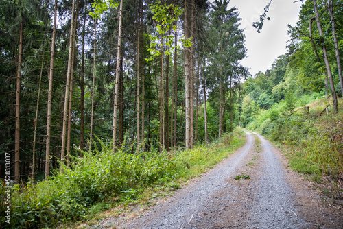 © Germanroam, Fototapeta premium Path in the summer forest, gravel road up the green hill
