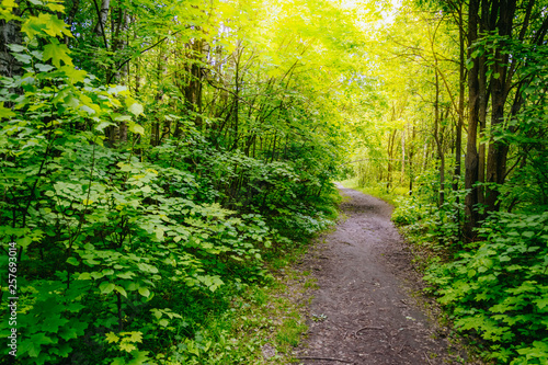 Fototapeta premium Path in the summer forest with green grass and trees