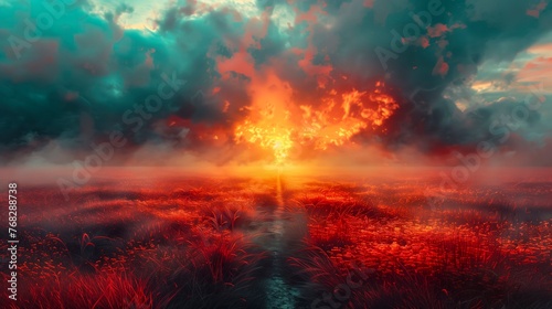 Fototapeta premium Path leads through a field under a dramatic sky ablaze with sunset colors, offering a stunning visual for themes of journeys, hope, and the power of nature.