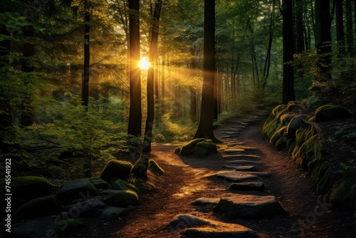 Obraz premium Path mountain light route. Forest green. Generate Ai