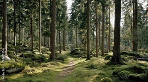 Obraz premium Path through a dense forest filled with tall trees and mossy rocks.