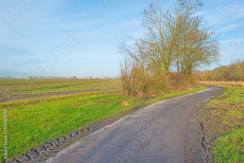 © Naj, Fototapeta premium Path through a field along buildings of a city on the horizon