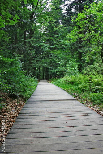 © Monika, Obraz premium Path through a forest lined with planks, fir forest, Świętokrzyskie Mountains
