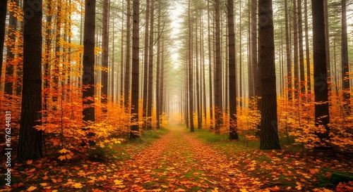 © jubair, Fototapeta premium Path through a forest with vibrant orange and yellow autumn leaves on the ground and trees