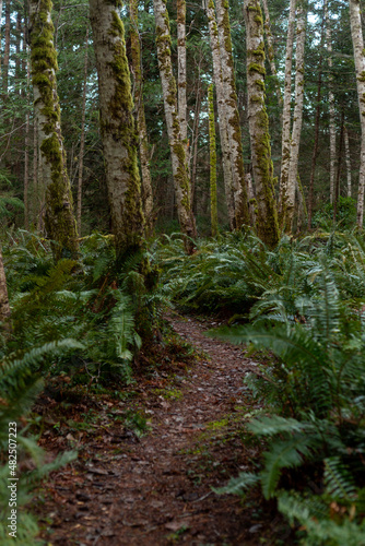 © Jennifer, Fototapeta premium Path through a mossy forest woods with ferns