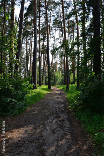 © Irina, Fototapeta premium Path through a sunlit forest, with tall trees and dappled light vertical