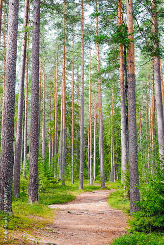 © Igor Luschay, Obraz premium Path through a tall, sunlit pine forest.
