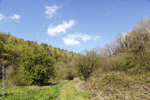 Obraz premium Path through a typical Welsh valley with trees and sunny ble skies - Ilston...