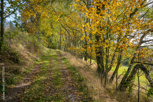 © Jaroslav Machacek, Fototapeta premium Path through autumnal countryside with colorful birches