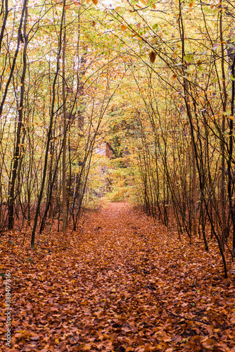 © Andreas, Obraz premium path through autumnal forest beech leaves on ground