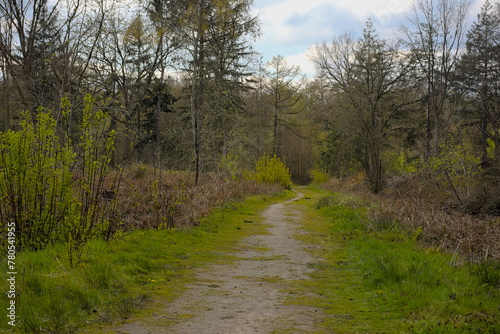 Fototapeta premium Path through Drongengoed forest on a sunny spring day, Eeklo, flanders, Belgium