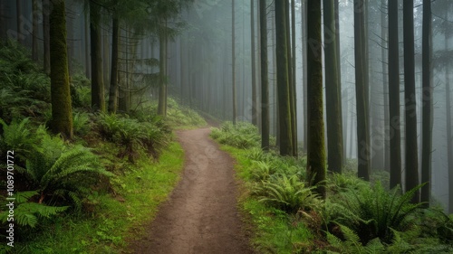 Naklejka premium Path through Foggy Forest: A winding path beckons through a dense forest,...