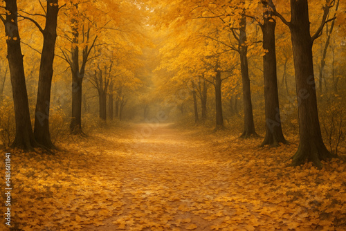 © Midea , Fototapeta premium Path through forest with yellow leaves.