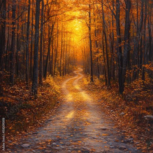 © Fahurdin, Fototapeta premium Path through forest with yellow leaves in painting.
