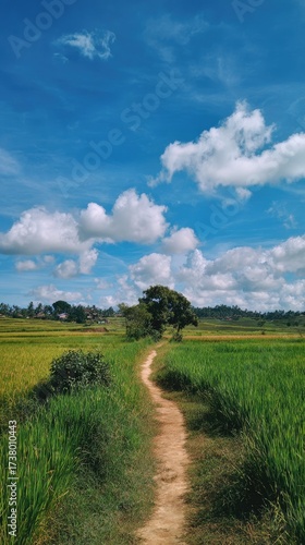 © Ferdi, Obraz premium Path through green rice fields under a bright blue sky with fluffy clouds