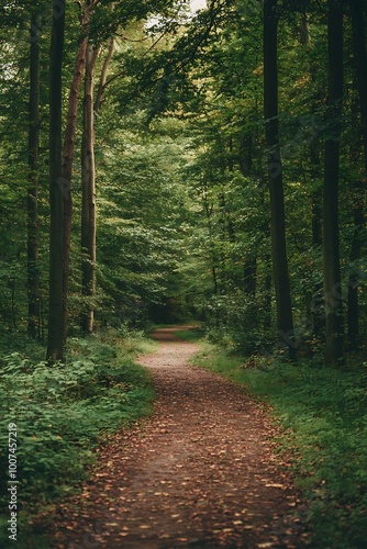 Fototapeta premium Path through lush green forest, nature background, trees, woodland trail