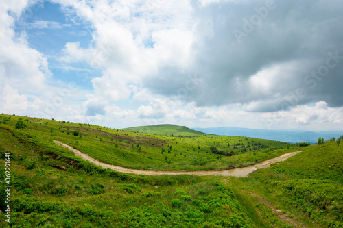 Fototapeta premium path through mountain landscape. road through green rolling hills. cloudy...