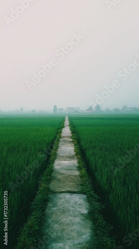 © Mace, Obraz premium Path through rice field on misty day. Agriculture, tourism, peaceful background