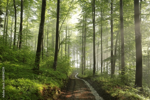 © Aniszewski, Fototapeta premium Path through spring beech forest after rainfall