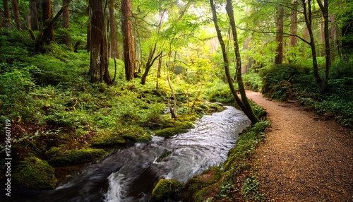 Obraz premium Path Through The Forest Trees With Flowing Water