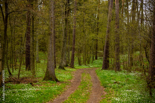 Obraz premium Path through the Warmian green forest - spring white anemone flowers, green...