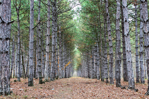 Obraz premium Path trough pine trees in the forest on a cloudy autumn day