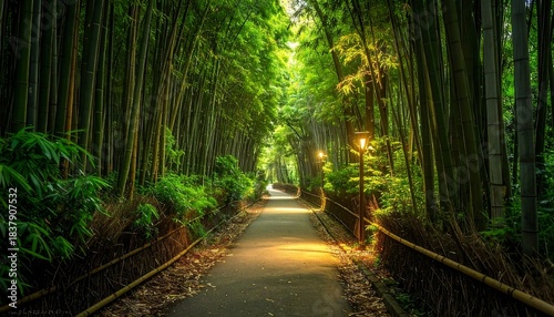 Obraz premium Path winds through a verdant bamboo forest, illuminated by sunlight and gentle lamps. Serene, lush, and inviting