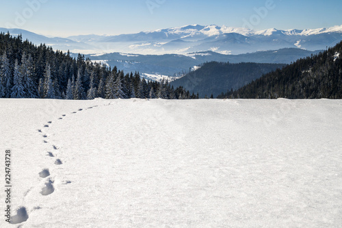 © bilanol, Naklejka premium Path with footprints in snow in winter mountains.