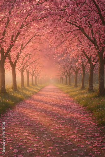 Naklejka premium Pathway Covered with Pink Sakura Petals at Dawn.